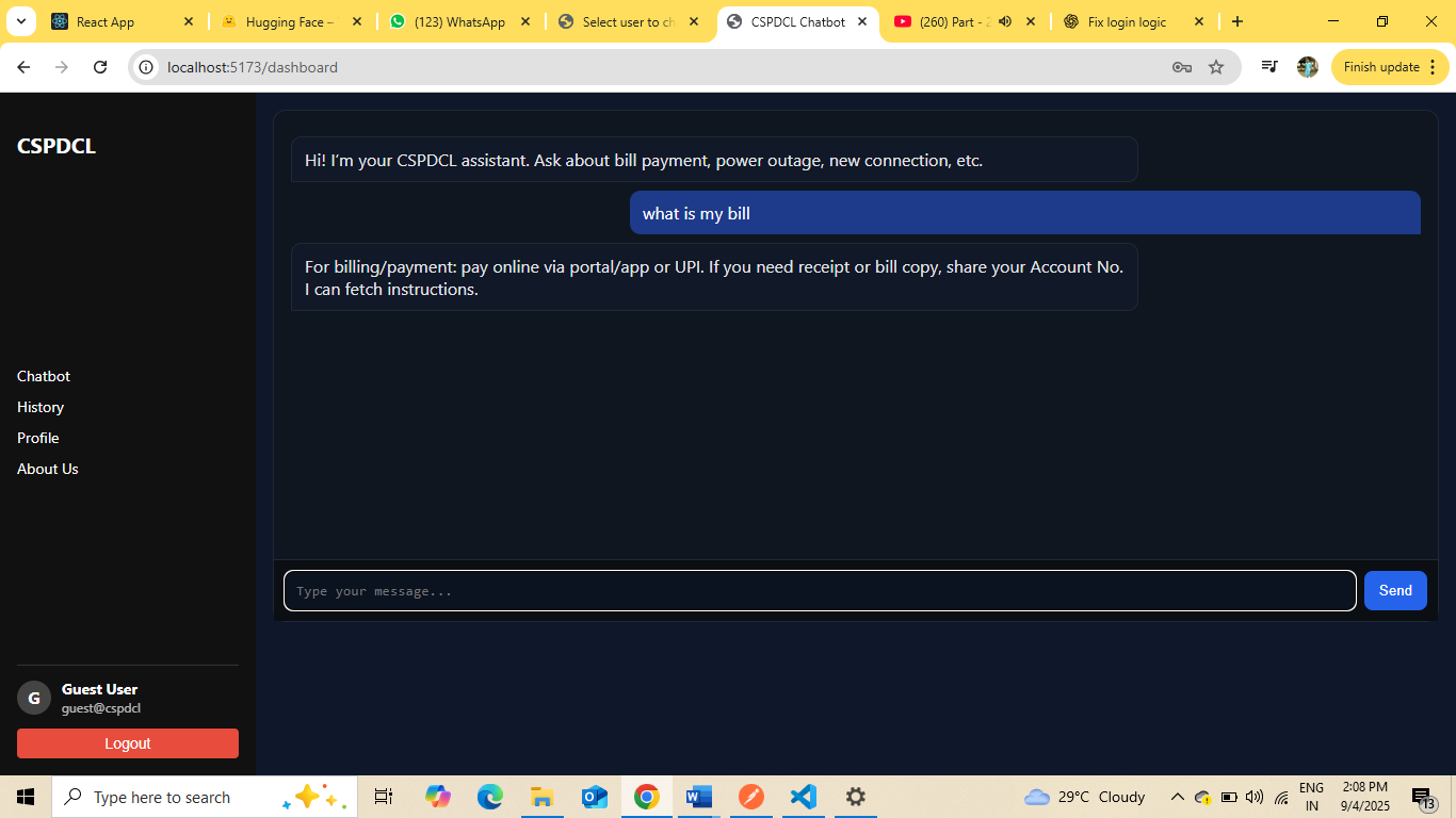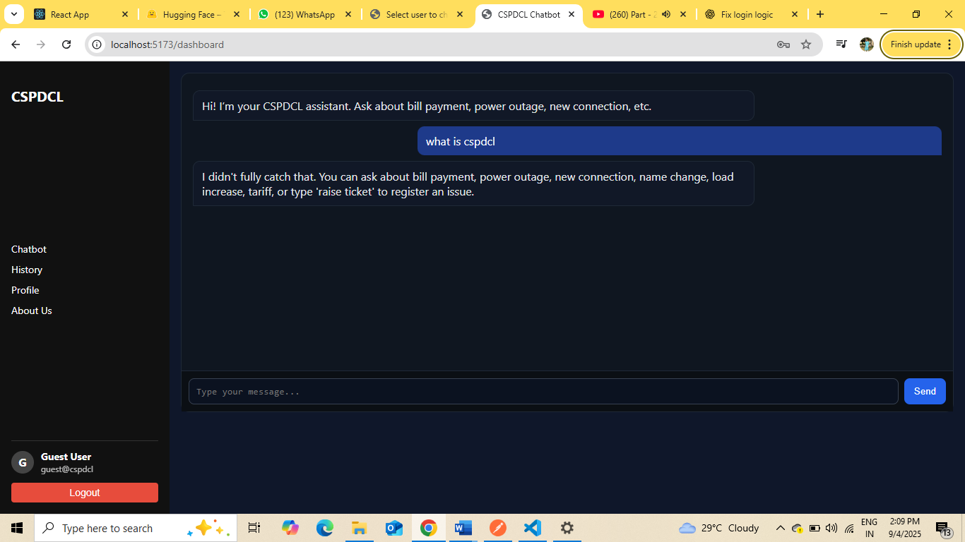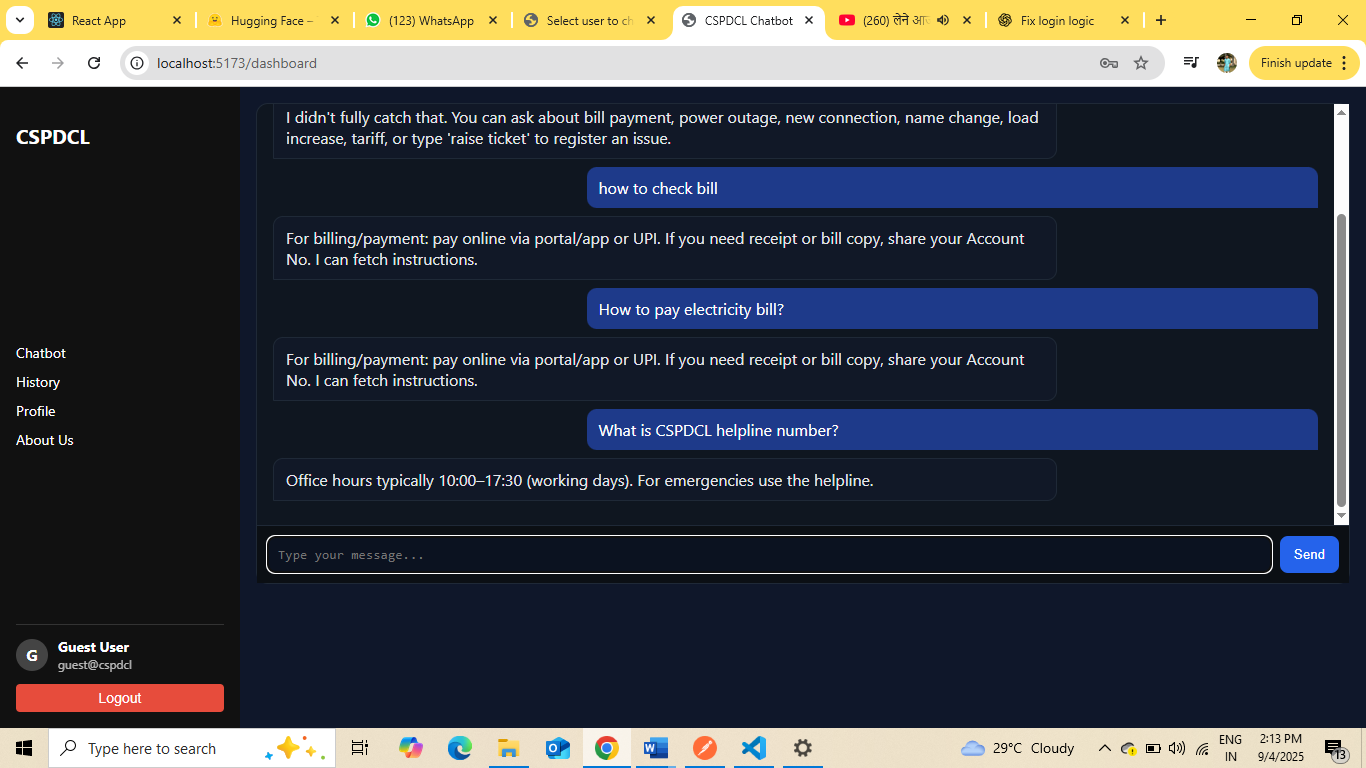 This project is an electricity service chatbot developed for handling customer queries related to CSPDCL services. Users can ask questions about electricity bills, complaints, and services.
